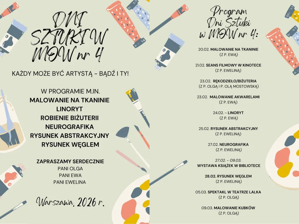Między 20 lutego a 9 marca w naszym ośrodku odbędzie się cykl zajęć pod wspólnym tytułem „Dni Sztuki w MOW nr 4”. Chłopcy będą uczestniczyć w warsztatach i zajęciach pod hasłem „Każdy może być artystą – bądź i Ty!”.