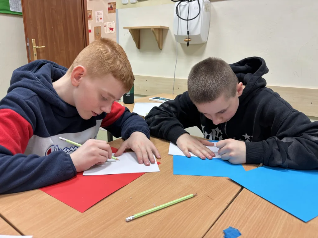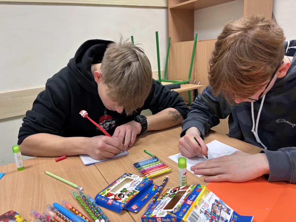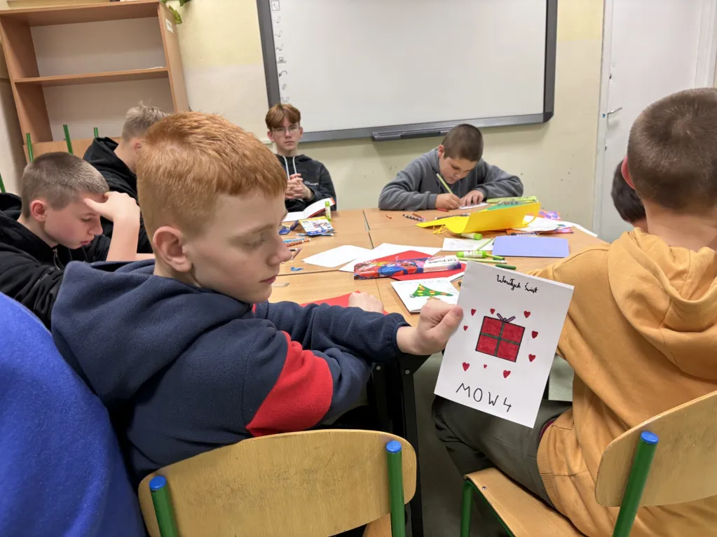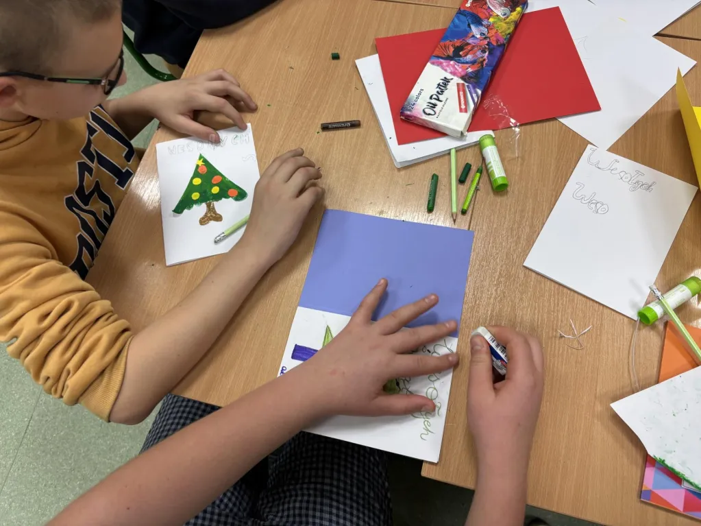 Weekend chłopcy spędzili w twórczej atmosferze, wykonując własnoręcznie kartki bożonarodzeniowe. Z zaangażowaniem wybierali: wzory, kolorowe papiery i ozdoby, a następnie tworzyli wyjątkowe kompozycje, w które włożyli wiele serca i pomysłowości. Praca nad kartkami była dla nich nie tylko okazją do rozwijania umiejętności plastycznych, lecz także chwilą wyciszenia, współpracy i budowania pozytywnych relacji. Efekty ich pracy są pełne uroku i świątecznego nastroju, a każdy wykonany projekt stanowi mały dowód na to, że wspólne działanie potrafi przynieść wiele radości.