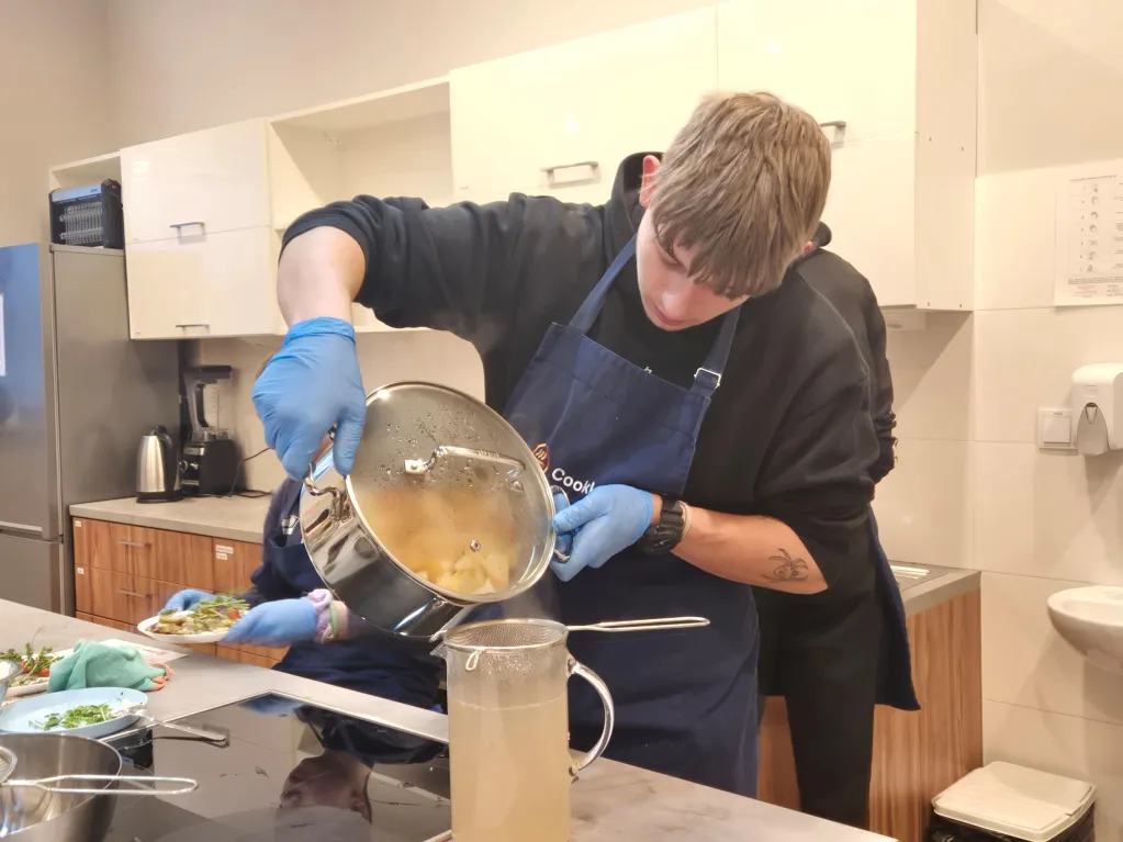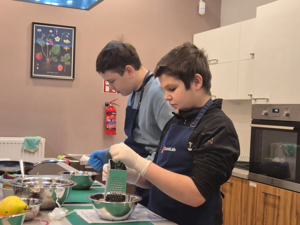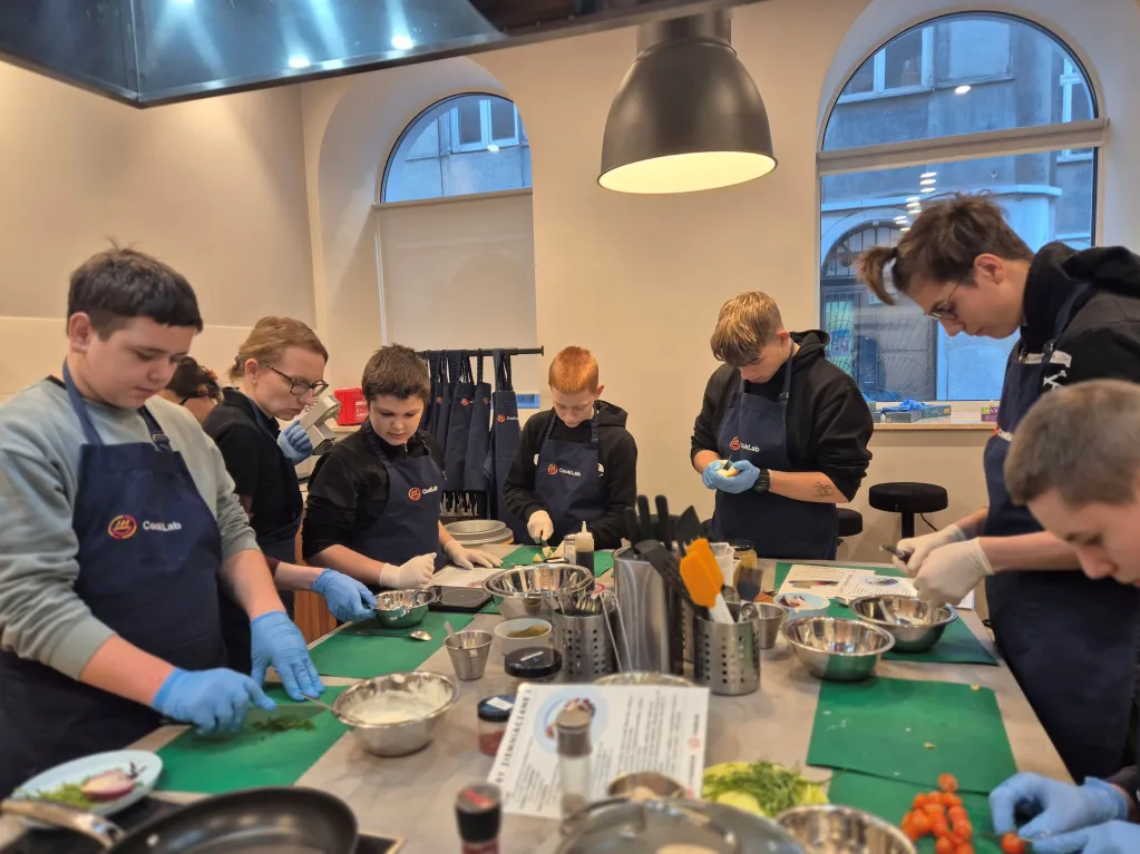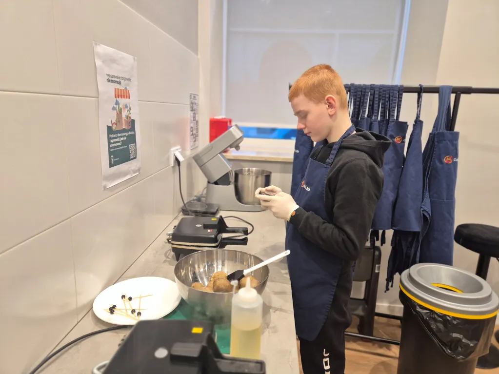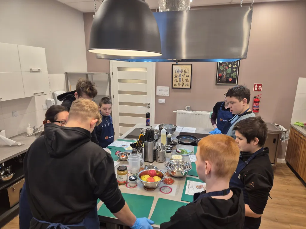 2 lutego ponownie odwiedziliśmy pracownię kulinarną CookLab. Tym razem przygotowaliśmy obiadowy zestaw z ziemniakiem w roli głównej. Mało kto pamięta, że to zdrowe warzywo do Polski trafiło po zwycięstwie Jana III Sobieskiego pod Wiedniem. Początkowo uprawiano je jako roślinę ozdobną w ogrodach królewskich. Gdy rozpoczęto podawanie potraw ziemniaczanych w Wilanowie, nie wzbudziły one entuzjazmu. Dziś trudno sobie wyobrazić tygodniowy jadłospis bez ziemniaków. Pod kierunkiem Pań instruktorek chłopcy przygotowali ziemniaczane gofry z całą paletą zdrowych, pełnych witamin dodatków oraz rozgrzewający jabłkowo-imbirowy kompot. Współpraca w kuchni zakończyła się sukcesem! Efektem pracy było nie tylko smaczne danie, ale także zacieśnienie relacji między uczestnikami, integracja i wymiana kulinarnych doświadczeń.
