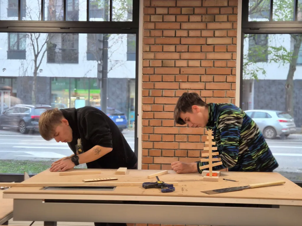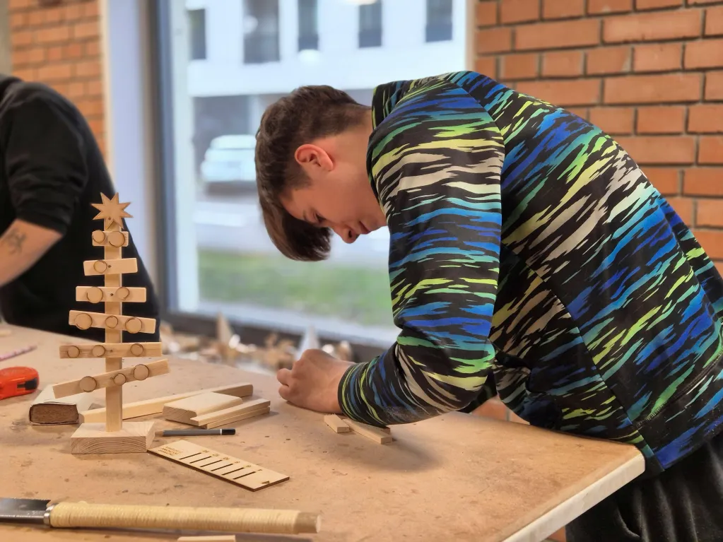 Warsztaty stolarskie rozwijają kreatywność, wyobraźnię przestrzenną, zdolności manualne i koordynację, uczą cierpliwości, dokładności, budują pewność siebie oraz poczucie sprawczości poprzez naukę pracy z narzędziami i tworzenie przedmiotów z drewna. Ostatnie spotkanie w tym roku kalendarzowym z instruktorami stolarki było okazją do wykonania choinek, które za kilkanaście dni ozdobią nasze świąteczne stoły.
